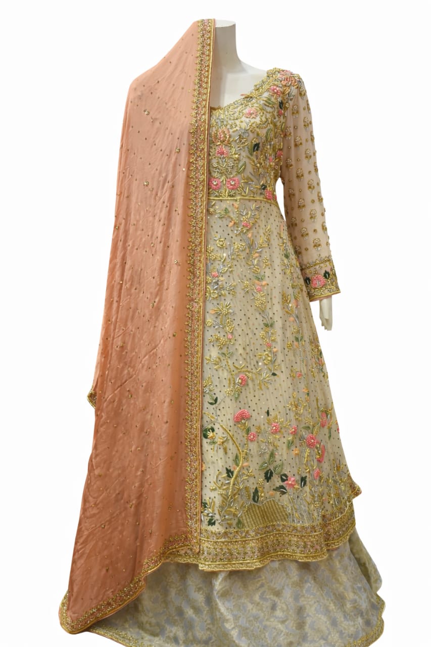 this stunning formal ensemble features a beautiful crafted maxi with golden silver kora dabka work and floral hand embriodery in sost pastel tones,the delicate detailing creates a graceful and luxurious look,perfect for special occasions